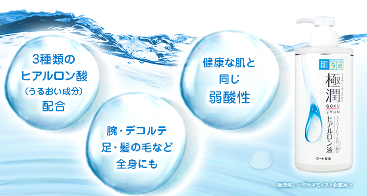 肌が本当に求めるうるおいを追求した、「極潤」。うるおい成分であるヒアルロン酸にこだわり抜き、必要のないものはできる限り削ぎ落として、配合成分と容器をシンプルにしました。