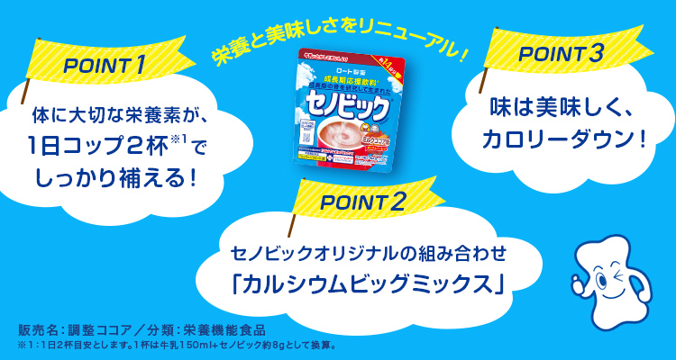 セノビック独自の「カルシウムビッグミックス」を採用した、栄養機能食品(カルシウム・ビタミンD・鉄)。