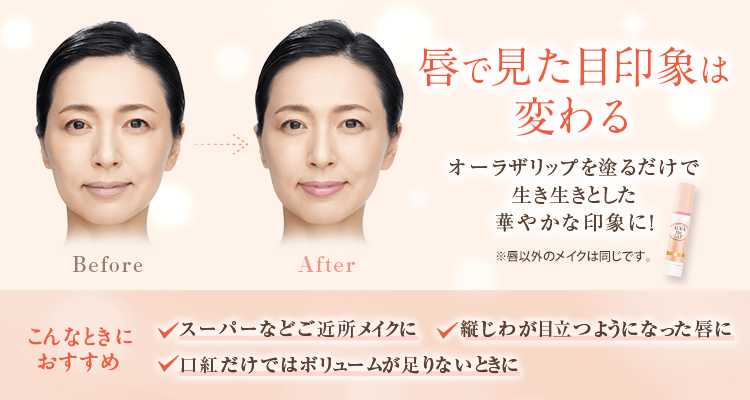 乾燥による縦じわやくすみなど、見た目の年齢サインが気になり始め、しぼんで見えるようになった唇をキレイに見せる*1高保湿美容リップです。肌なじみのよい気品あるピンク色が、ひと塗りでくすみを補正して血色感をアップさせ、唇そのものが色づいているような、美しく自然な見た目に。そして、塗った瞬間に唇を包み込んでツヤを補い、縦じわの気にならないふっくらとした唇に演出します。4つのうるおい美容成分*2と温感成分*3を配合。