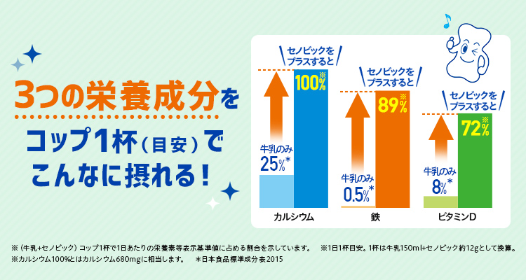1杯で1日に体に大切な栄養素であるカルシウム、鉄、ビタミンDを補うセノビックPlus。