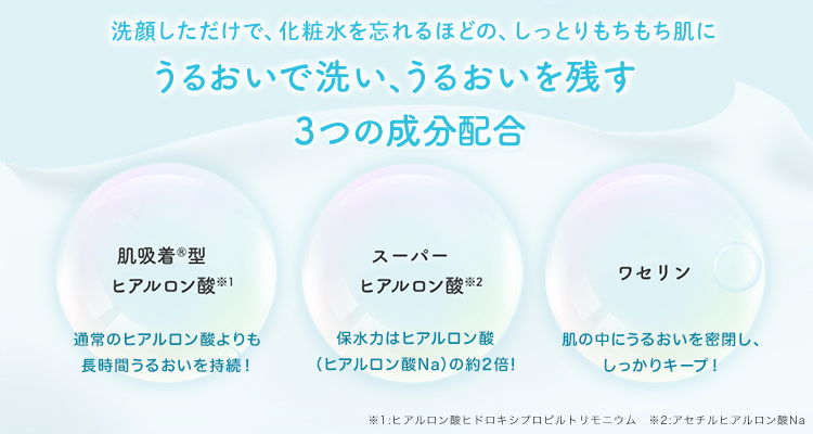 うるおい感と心地よい洗い上がりにこだわった洗顔料です。高い保水力で知られるヒアルロン酸の約2倍もの水分を抱えることができるスーパーヒアルロン酸(アセチルヒアルロン酸Na*)や、水で流した後も肌に吸着して残る肌吸着型ヒアルロン酸(ヒアルロン酸ヒドロキシプロピルトリモニウム*)、保湿力の高いワセリン*を配合。余分な皮脂や汚れをきちんと落として潤いを与え、洗うたび、パックしたようなしっとりなめらかな素肌へ導きます。W洗顔なしでメイクも落とせます。