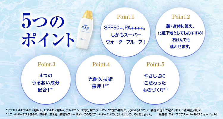 スキンアクアシリーズ内で最高のUVカット効果をもつみずみずしいジェルタイプの日やけ止めです。光耐久技術を採用し、光によるUVカット機能の低下が起こりにくくなる独自成分を配合しています。SPF50+、PA++++、汗・水に強いスーパーウォータープルーフ。顔とからだにお使いいただけます。無香料、無着色、鉱物油フリー。石けんで落とせます。アレルギーテスト済み*3