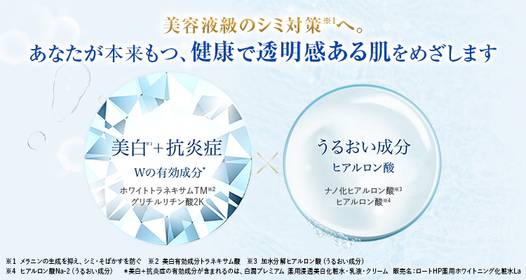 うるおいと白さにこだわる、美容液のようなさっぱりタイプの薬用美白化粧水です。美白有効成分としてホワイトトラネキサム酸*1、グリチルリチン酸2Kを配合。整肌保湿成分としてビタミンC誘導体*2、ビタミンE、うるおい成分として2種のヒアルロン酸*3も配合しました。紫外線ダメージを受けた肌の角層深くまで浸透し、シミの元であるメラノサイトへアプローチして、うるおいに満ちた美白肌へと導きます。健康な素肌と同じ弱酸性。肌へのやさしさに配慮した無香料・無着色・鉱物油フリー・アルコール(エタノール)フリー・パラベンフリーです。