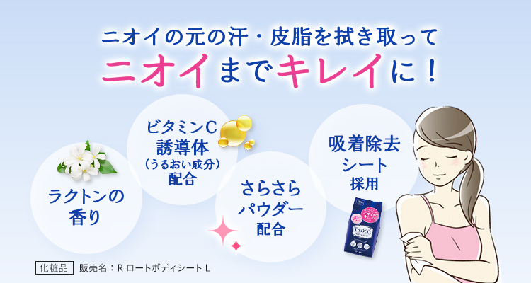 白泥(吸着剤)・さらさらパウダー配合。ニオイの元となる皮脂を吸着し、肌さらさら!年齢とともに減少する甘い香りの成分「ラクトン」を含有する香料を配合。スウィートフローラルの香りです。さらに、うるおい成分ビタミンC誘導体を配合しています。また、吸着除去シートがひと拭きで汗や汚れをからめとります。寝起き・学校やオフィス・スポーツ後など、全身にお使いいただけます。