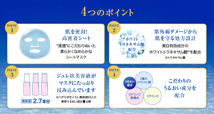 抗炎症作用のあるホワイトトラネキサム酸★(美白有効成分)と、うるおい成分として2種類のヒアルロン酸やビタミンC誘導体、ビタミンEを配合。また、繊維刺激が少ないやさしい肌あたりが特長でコットン生まれの不織布ベンリーゼ®を採用。液をたっぷりと抱え込むので、肌への密着力に優れています。
