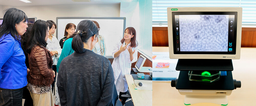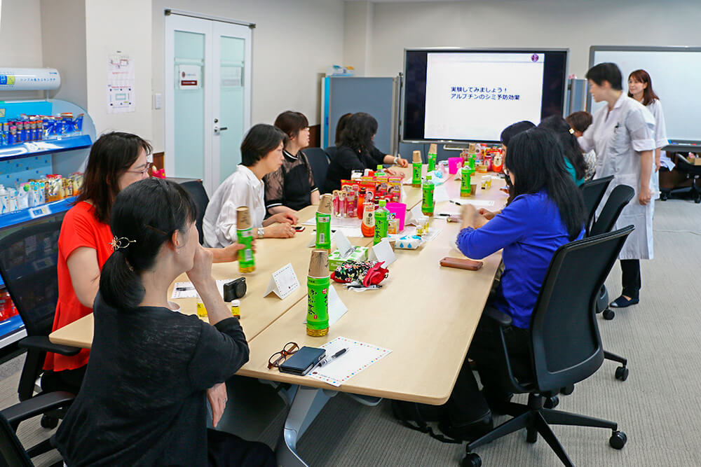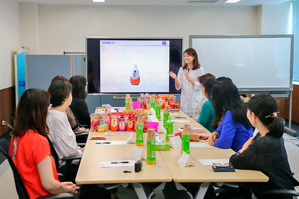®お手入れ会』で、「もっと商品のことを詳しく知りたい!」という意見を多くいただいたことで実現した今回のイベント。開発担当者が50の恵®商品に対する熱い想いを語ったほか、美白有効成分の性質を知るための実験や肌チェック体験、質問コーナーなどもご用意しました。