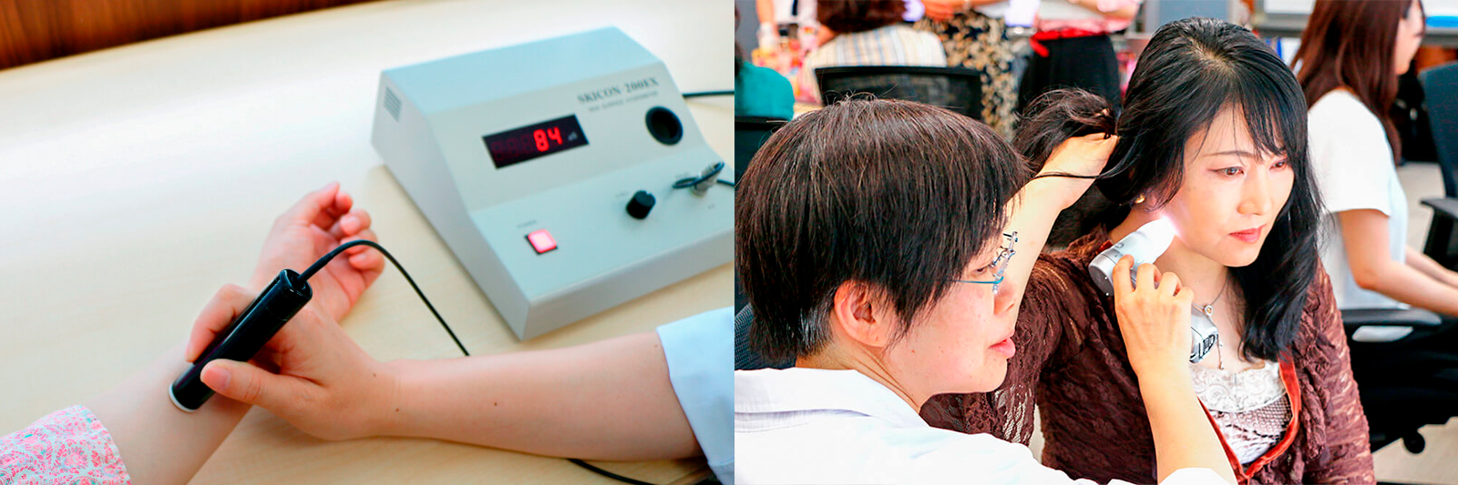 まずチェックシートに肌の悩みを記入していただき、スタッフが機器を使って肌の水分量を測ったり、キメの状態を1人1人チェックしました。