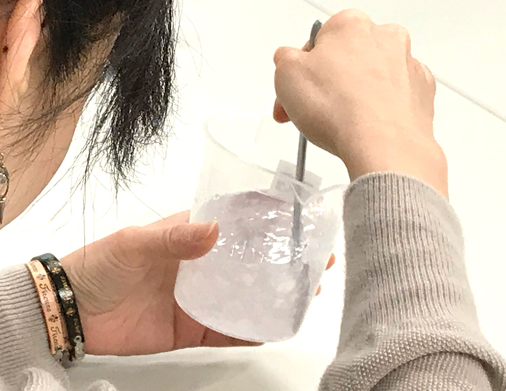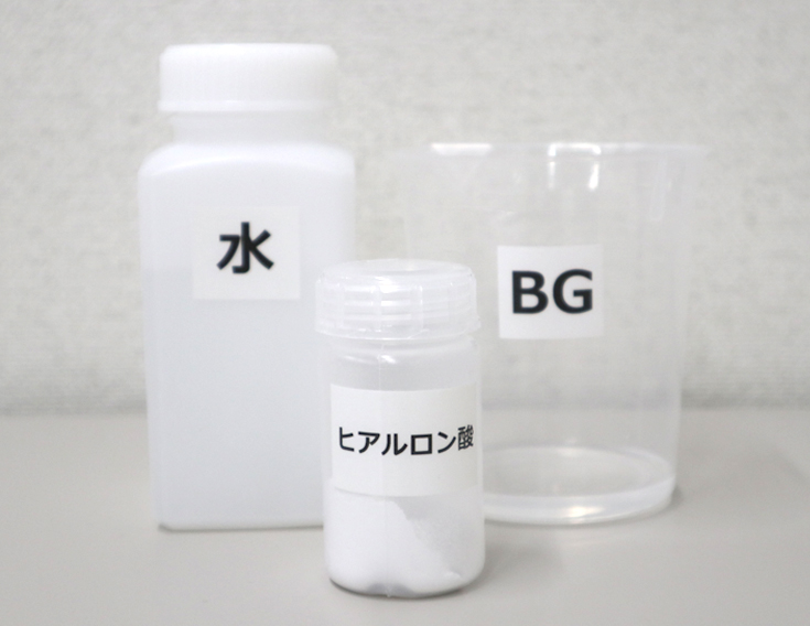 この「BG」とは、化粧水などにも多く使われている湿潤剤。BGの入ったカップにヒアルロン酸の粉を入れ、薬さじでグルグルと混ぜると、徐々にダマがなくなりサラサラとした液体になります。