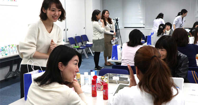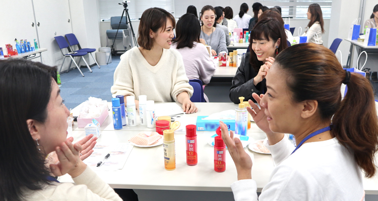 「子供に昔の写真を見せたら『肌キレイ!この頃の肌に戻って』と言われた(涙)」「韓流の女優さんみたいな、白くて陶器のような肌になりたい!」といったざっくばらんなおしゃべりから、「極潤®αと極潤®プレミアムって、どう違うの?」「私の年齢に合う商品はどれかしら?」「肌ラボの入浴剤を作ってほしい!」といった商品に関する話題まで、お話は尽きません。