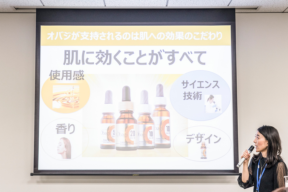 まずは、オバジブランドリーダーより、オバジのブランドストーリーやビタミンCにこだわる理由についてご紹介しました。オバジCに含まれるビタミンC量、高濃度ビタミンCをフレッシュな状態でお届けするために施されている瓶内の工夫など、ちょっとした裏話も。