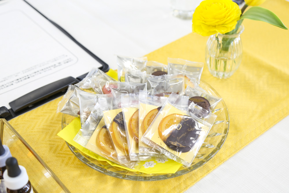 キャッチフレーズで頭を使った後は、お楽しみのティーブレイク。今回はビタミンCを含み、国産オレンジにこだわったオランジェットと気軽に召し上がれるプティガトーをご用意。