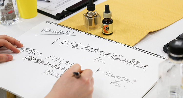 テーブルの皆さんで「オバジのキャッチフレーズ」をスタッフと一緒に考える時間です。たくさんの素敵なキャッチフレーズが出てきたのですが、3つ案を抜粋しますね。