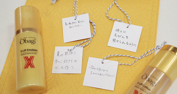 モデルさんの仕上がりを見て、皆さんの気持ちが高まった所で、オバジX1ヶ月チャレンジのご案内。参加してくださったみなさまがそれぞれの肌悩みに合わせて、オバジXを使って、1ヶ月後にどんな肌になりたい?と、皆さん・スタッフで宣言。毎日の肌のお手入れに使っていただき、目指す肌になれますように!