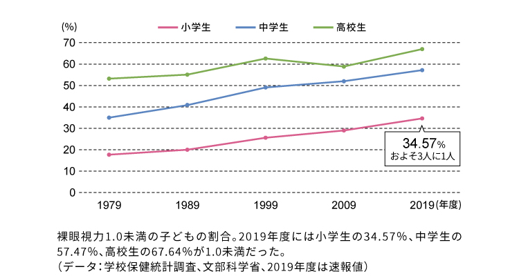 2019年度では、小学生の3人に1人以上、中学生では半数以上、高校生では3人に2人以上が視力1.0未満という結果が出ています。