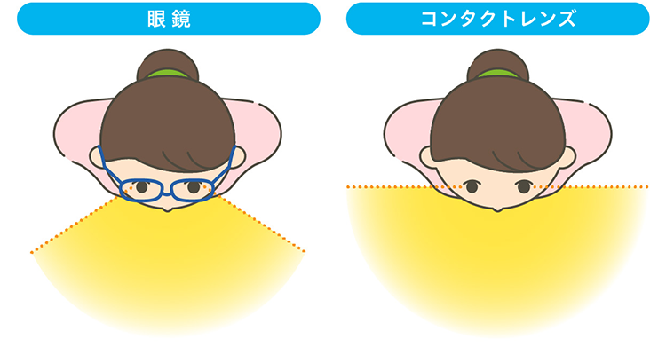 虫眼鏡を近づけたり遠ざけたりすると、見るものの大きさが変わるように、角膜からレンズまで1~1.5cmほどの距離がある眼鏡では、少し歪みが出てしまいます。一方、目の上に直接レンズを乗せるコンタクトレンズは、ほぼ裸眼と同じ視界になるんです。