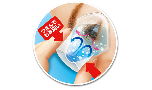 目に当てるイージーカップは、目頭から目尻までしっかりカバーできる大きさで、フィットしやすく跡が残りにくい柔らかな素材を使用。もちろん上を向いても使えますが、下を向いたままでも使えるのがポイントで、目に当てながらカップをゆっくり押すと、薬液の対流洗浄で汚れをかき出し、まるで目の中を丸ごともみ洗いするようにすっきり洗えるんです。