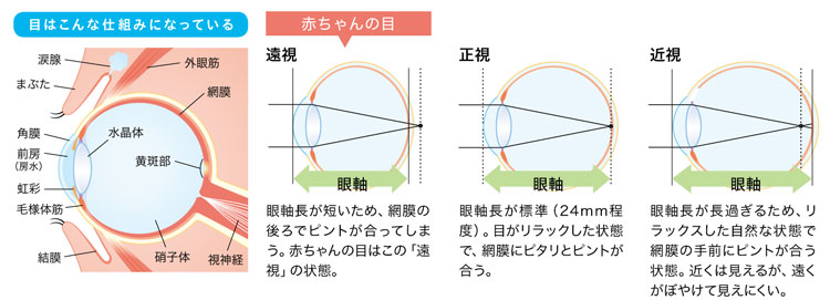 ヒトの目は、5m以上遠くを見た時がリラックスした自然な状態です。目が疲れたら「遠くの木を見て目を休めましょう」と言われた経験があるかもしれません。このリラックスした状態で網膜に正しくピントが合い、クリアな画像が得られる目が「正視」です。「近視」は、リラックス状態で網膜の手前でピントが結ばれ、逆に網膜よりも後ろで結ばれてしまうのが「遠視」です。