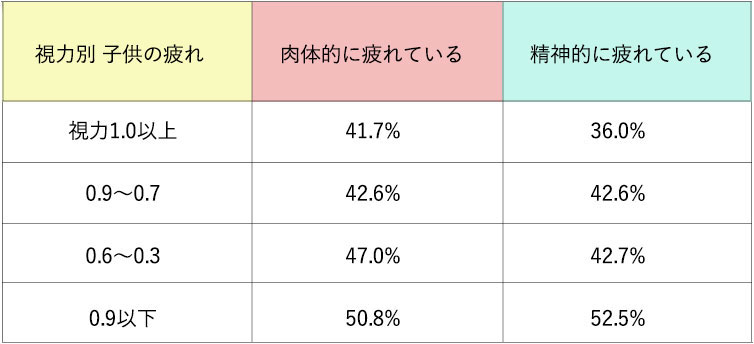 ロート製薬の調査*3によると、視力が低い子どもほど、疲れ度合いが高いというデータがあります。目の疲れが視力低下を引き起こし、肉体的・精神的な疲れにも関係していることが言えそうです。