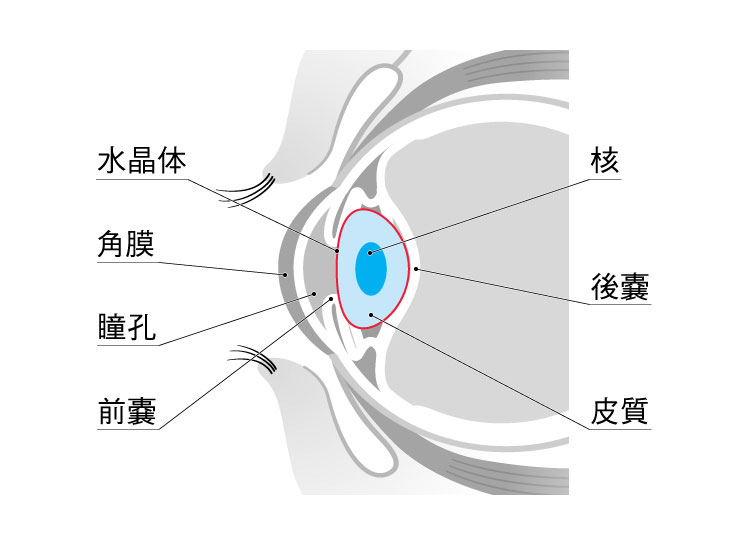 白内障は水晶体が白く濁る病気ですが、いきなり水晶体全体が真っ白になるわけではありません。水晶体の中のどの場所が濁るかによって分類され、その場所によって症状や見え方もさまざまに異なります。