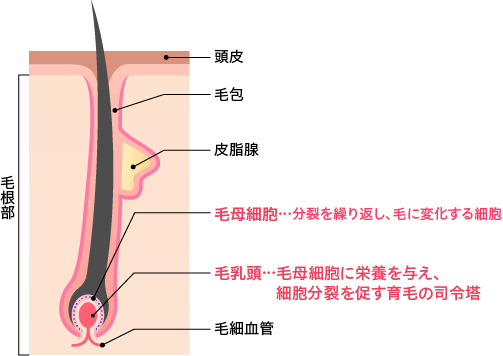 毛の発育には、毛根の深部にある「毛母細胞」と「毛乳頭」が重要です。