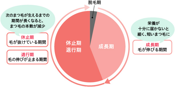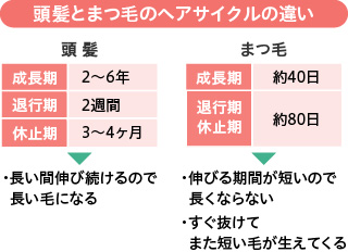 毛は、伸びる期間【成長期】→成長が止まり、毛が抜ける期間【退行期】→抜け落ちてから発毛までの準備段階に入る時期【休止期】を1サイクルとする毛周期を繰り返しています。髪の毛は1サイクルの毛周期が2~6年かかるのに対し、まつ毛は成長期が約40日、退行期・休止期が約80日のサイクルで、約120日で生え変わります。このように髪の毛と比べ、まつ毛の伸びる期間は短く、すぐに抜けて、また短い毛が生えてくるので、髪の毛のように伸び続けずに一定の長さを保っているのです。