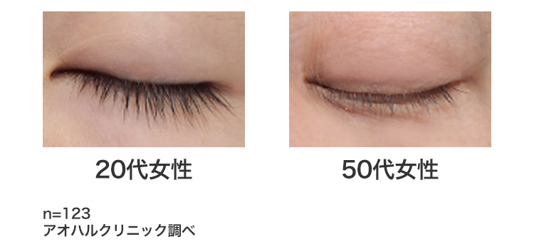 髪の毛同様、まつ毛も年齢とともにボリュームが減り、細く、短く、貧弱になっていってしまいます。年々、目元が寂しい印象になると感じてしまうのはこのためです。20歳から60歳までの女性123名のまつ毛の長さを調べたところ、50代は20代と比べ、なんとまつ毛の長さが10%も減少しているのだそうです。※1