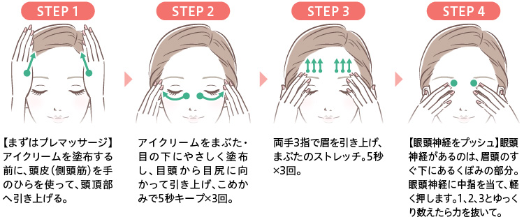 また、アイクリームを使って目周りのマッサージを行うことも効果的です。