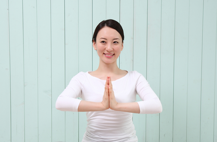 胸の前で手のひらを合わせ、内側へ押し合う。バストアップにも効果あり。