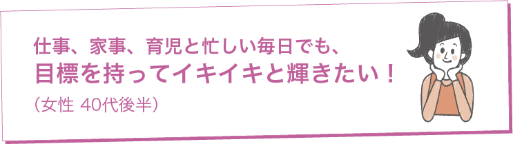 ここ数年3人の出産と育児で、昼夜問わず寝たり起きたりな不規則な生活をしているため、自分自身の生活リズムを整えたい。また、歩くことをきっかけに、運動をすることを毎日の生活のなかに取り入れたい。 (女性 30代後半)