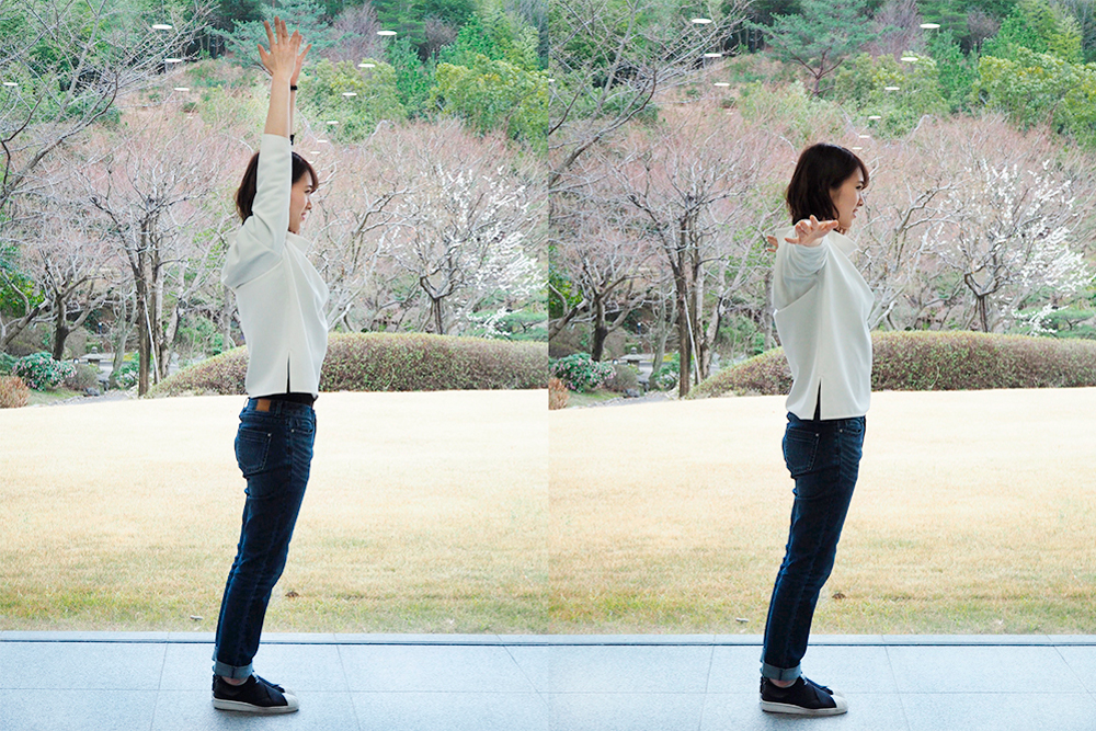 両手を上げている時が、背骨が最もキレイに伸びている状態。このまま歩き始めると、加齢とともに使わなくなってしまう筋肉を動かすことができ、さまざまな健康効果が期待できるのだそうです。