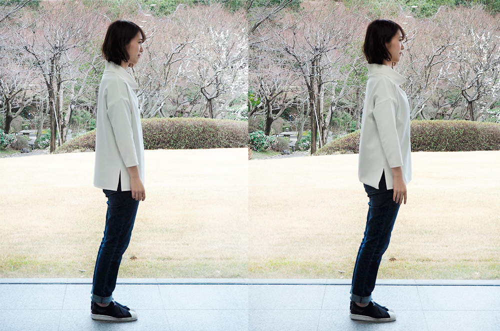 左が腕を上げる前、右が後。確かに背筋が伸びているのがわかります。