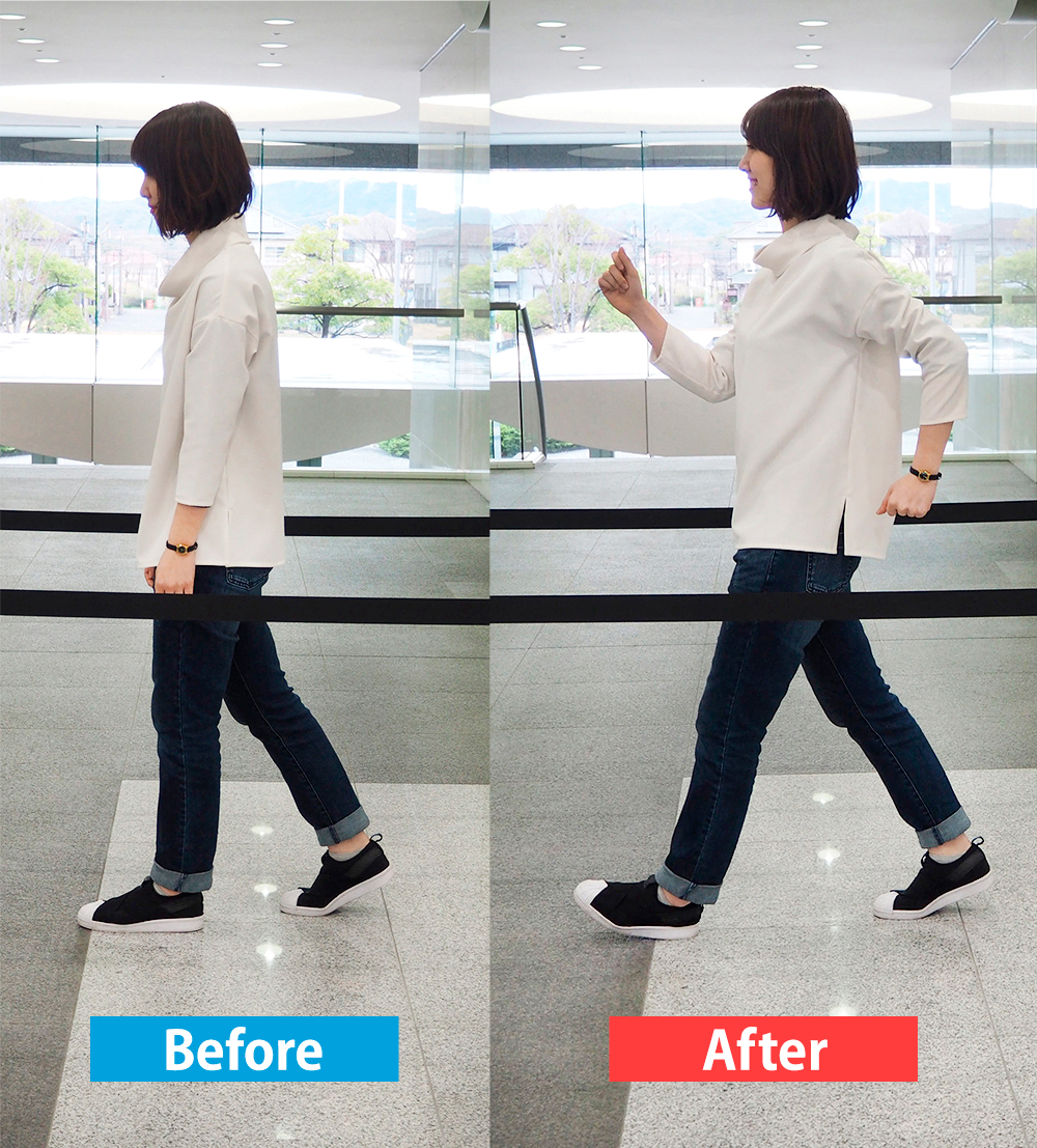 アフターは腕を上げて姿勢を伸ばしてから再チャレンジ!いきなりすべてのコツを実践するのは難しいので、とにかく腕を引くように意識して歩いてみました。
