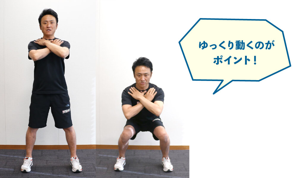 ①脚を腰幅に開き、手は胸に置き、太ももに負荷がかかるのを意識しながら腰を落とし、その後ゆっくり上がります。目安は10回。