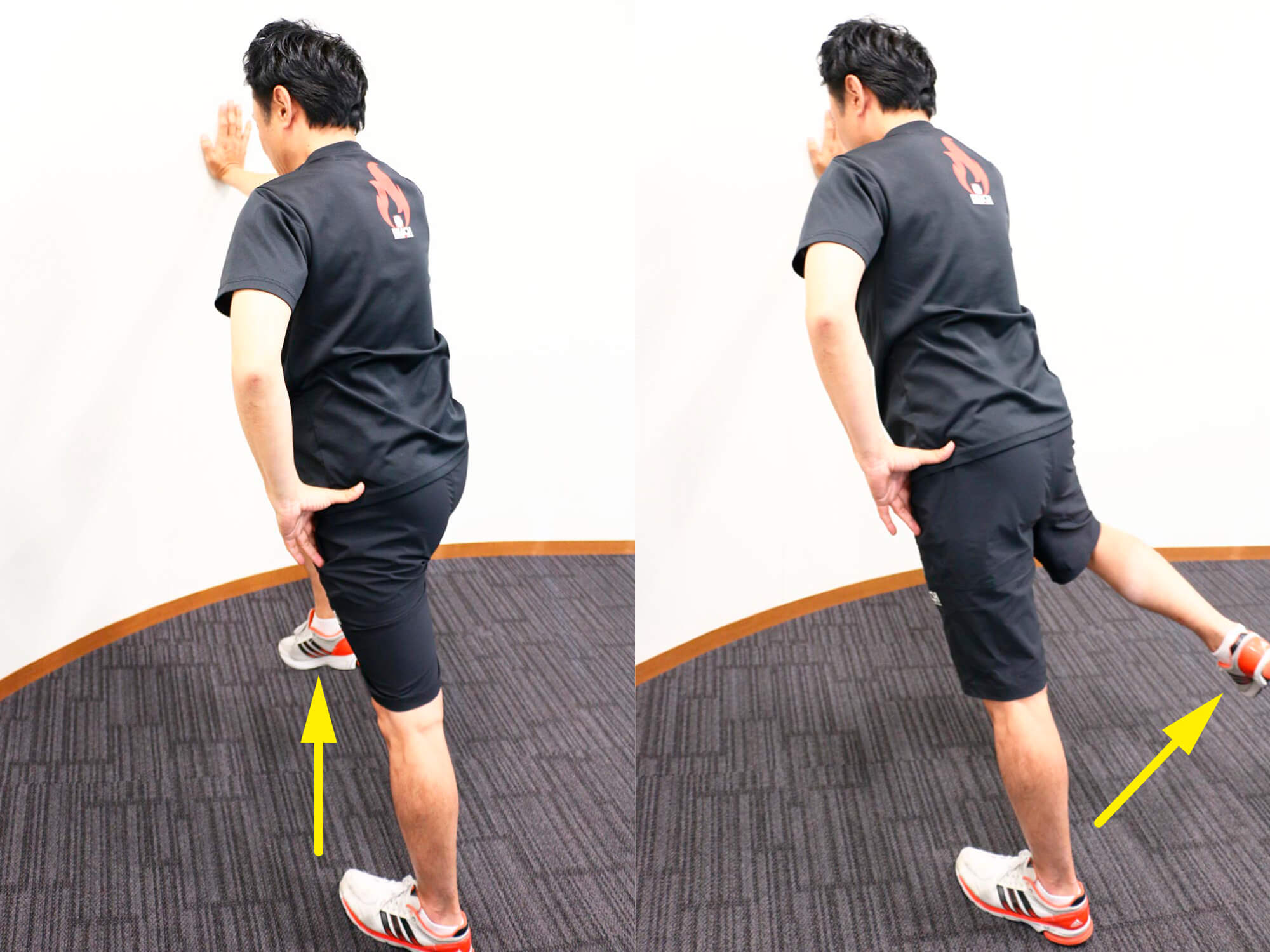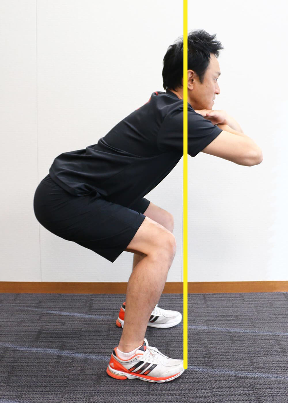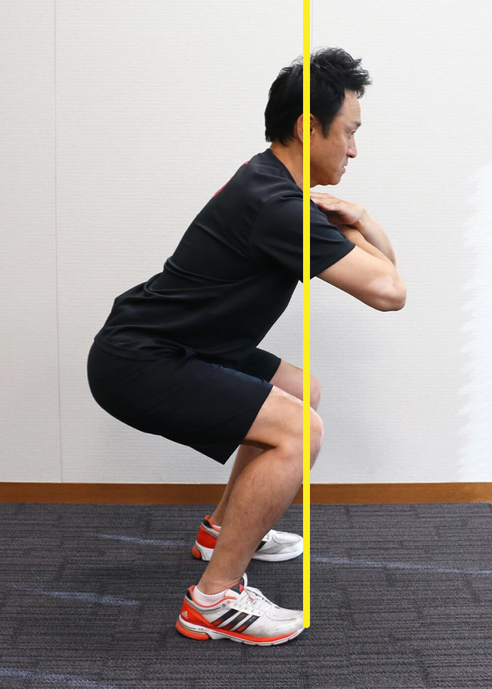 ②この時、横から見るとひざはつま先より少しだけ前に出るのが正しい姿勢。