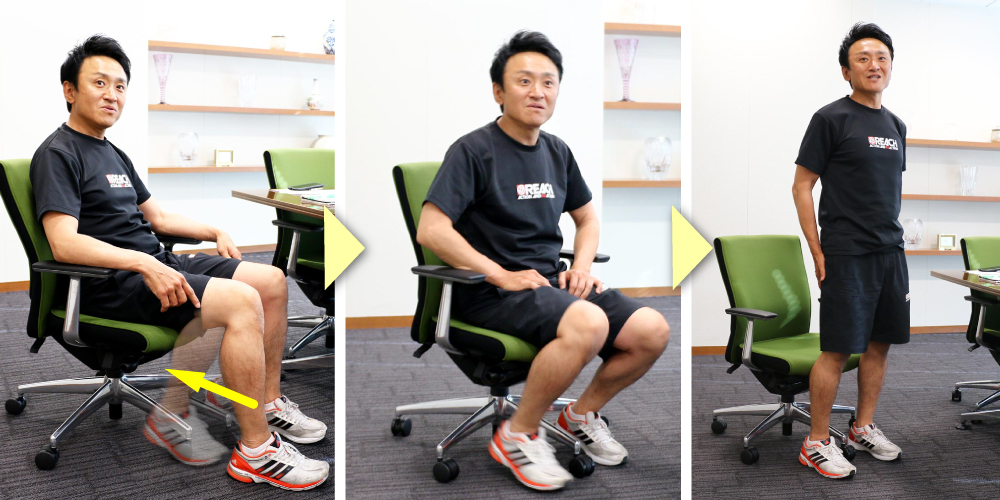 ④実はオフィスでも、スクワット効果を得られる方法が。イスから立ち上がる時、かかとを一旦お尻の方に引いてから立つようにするだけ。これが意外と効くんです!