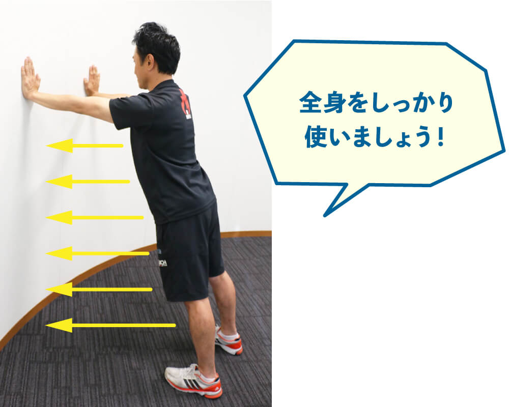①壁に向かって、かかとから頭までが一直線になるように立ちます。その姿勢のまま、腕を水平に伸ばし、手のひら全体を壁につけたら、手首で押すのではなく、全身の力を使いながら壁を押して20秒間キープ。