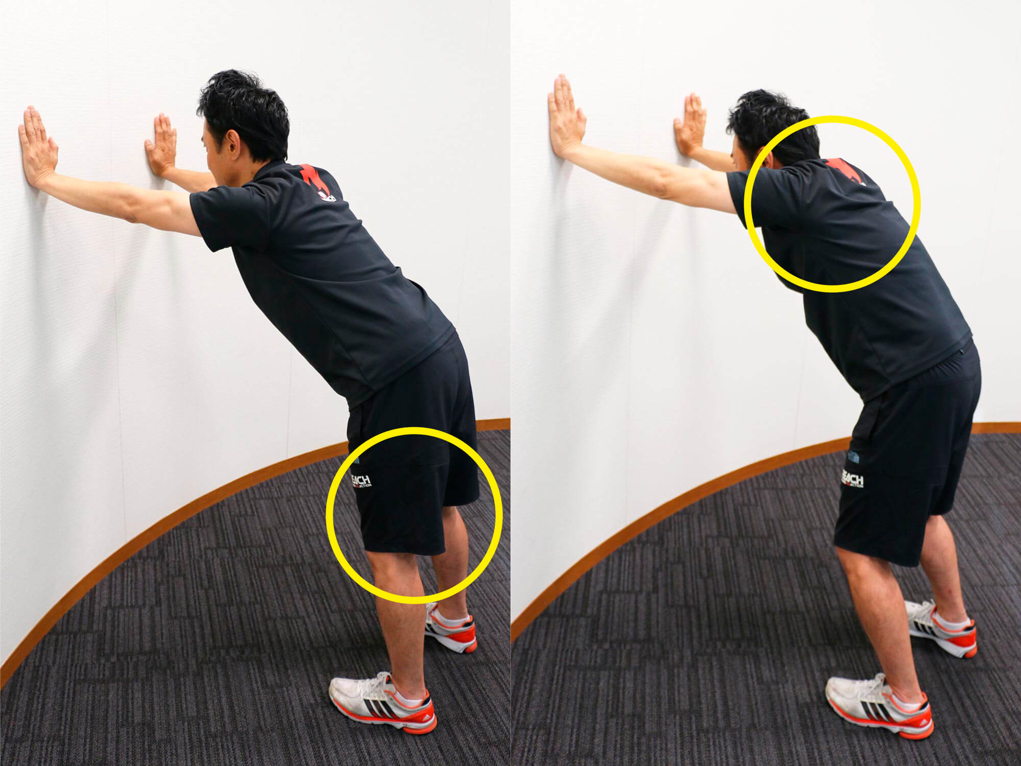 ③ひざが曲がっていたり、肩が丸まっている姿勢はNG。このトレーニングは、正しい姿勢が取れてないと効果がありません。足裏全体を床につけ、ひざや腰、上半身を伸ばし、肩が前に出ないように注意。