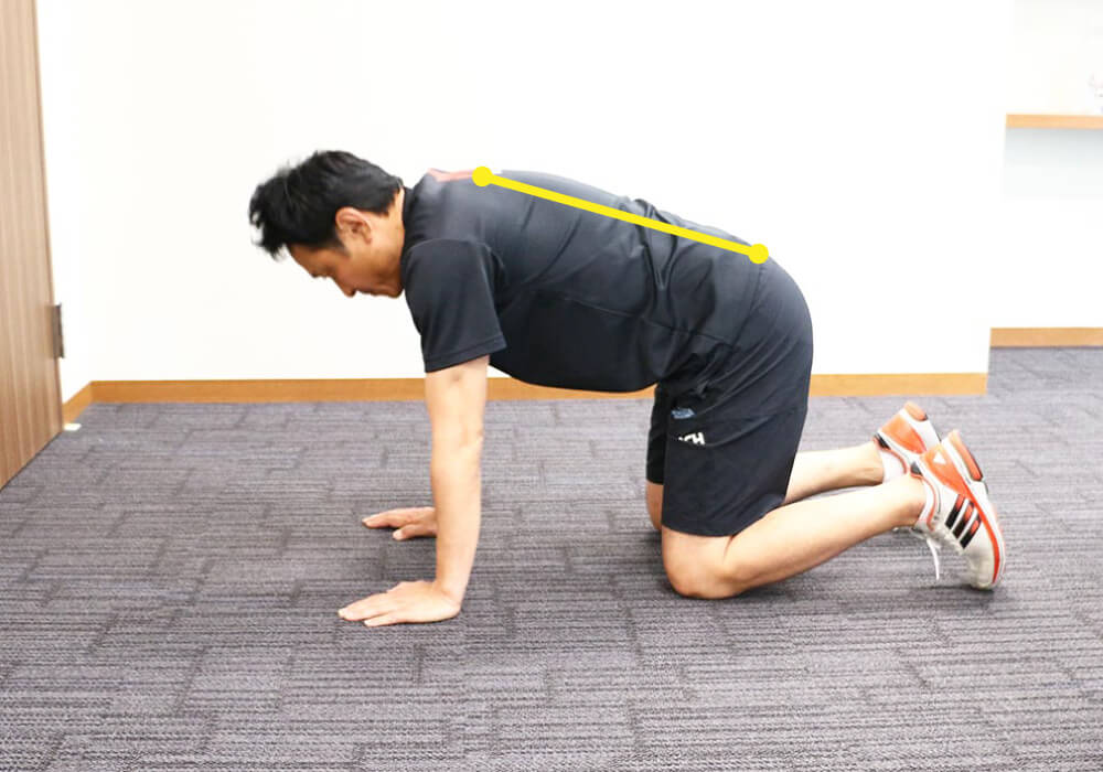 ①肩の真下に手首、股関節の真下にひざがくるように四つん這いポーズをとります。背筋が曲がらないように、まっすぐ伸ばしてください。