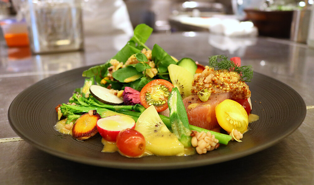 オードブルの「ビンチョウマグロとシークヮーサー、穀類の脳活サラダ仕立て」は旬の野菜をふんだんに使ったサラダです。野菜がたくさん食べられるメニューなので今回ご自宅で作っていただきたいとレシピを大公開します!