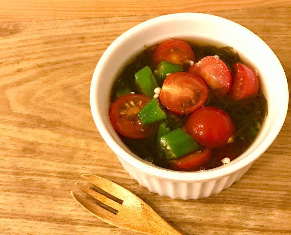 トマトとオクラを切って、もずくと合わせるだけ!トマトはビタミン豊富でほてりを冷まし、オクラは皮ふや粘膜を保護して胃腸の働きを助けると言われます。もずくは鎮静と粘膜保護、どちらの作用も持ち合わせたパワフル食材!日やけによってデリケートになった肌を整えてくれる、夏の副菜にぴったりの一皿です。