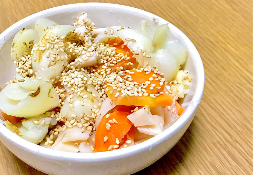 まず一品目は、 体液を潤してくれる白キクラゲや百合根、蓮根、胡麻を使った味わい深い和えもの。百合根にはイライラを鎮める働きもあるので、ストレスを感じやすい女性にとって積極的に摂りたい食材です。さらに、血を補うと言われている人参を加え、肌の血色をアップ!白キクラゲがないときは、蓮根の分量を増やしてみてください。