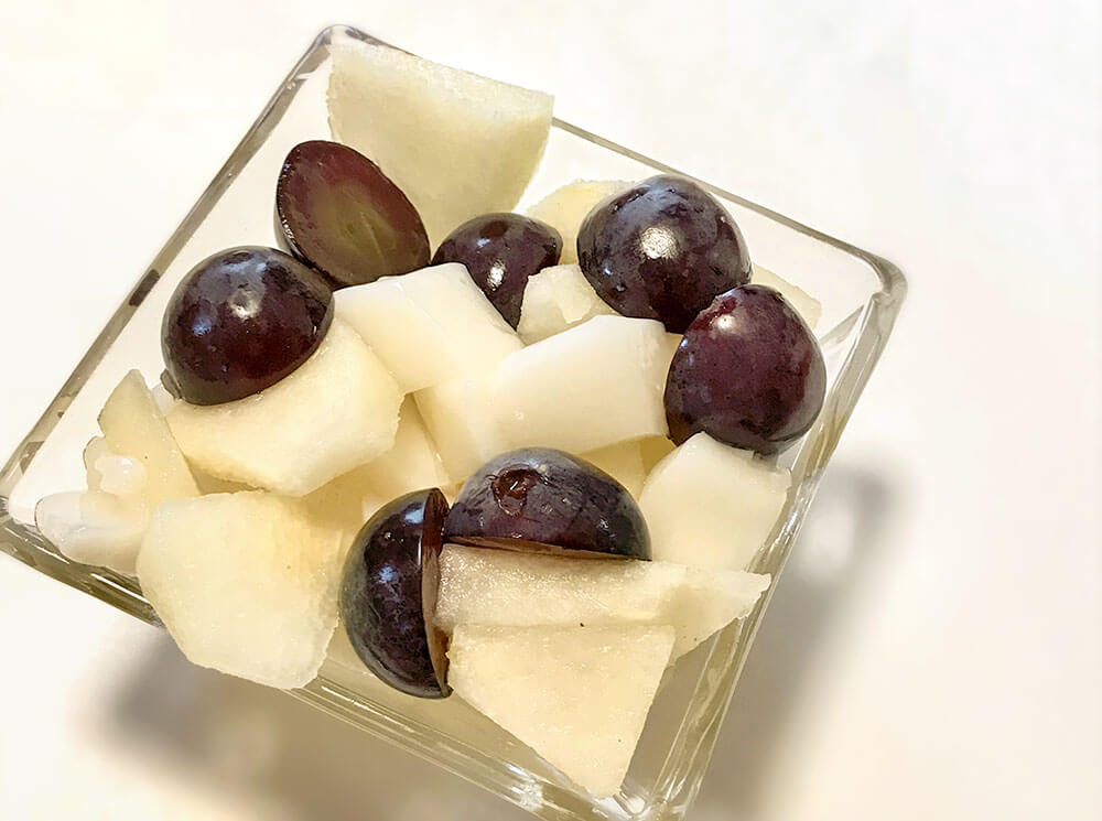 市販の杏仁豆腐に、おなじみのフルーツを加えるだけ!梨にもブドウにも杏仁豆腐にも、実は体液を潤す働きがあると言われています。ブドウはむくみの予防にも効果的。器に盛り付けるときは、混ぜずにフルーツを乗せれば彩りよく仕上がります。もう少し甘みが欲しいと感じたら、ハチミツをかけて調整してください。
