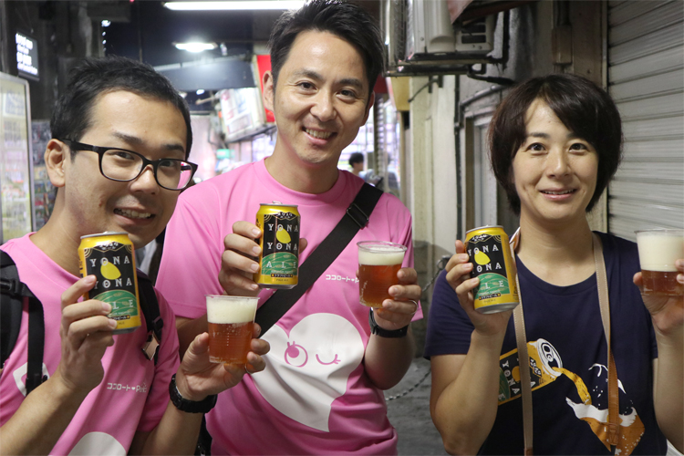 ロート製薬旧本社の場所に到着後、今回の企画のメインである区と区の界目を探して散策。明らかに、住所の表示は違うのに、境目を示すマークがありません。でも地図によれば、ちょうど、JRと近鉄の鶴橋駅の近くで、3つの区が接していることが判明!ヤッホーさんが持ち歩いてくれていた「よなよなエール」をおもむろに取り出してくれましたが、、、歩数は大丈夫なの?乾杯できる!?