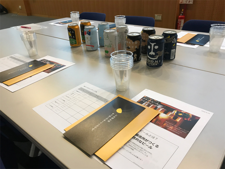 次は、お楽しみのテイスティング。お作法は目で「色」を感じ、鼻で「香り」を楽しみ、最後に口に含み「味わい」ます。まるでワインのようですね。ビールの色味が薄いものから濃いものへと、順番に6種類も試しながらテイスティングシートに感想を書き込みます。