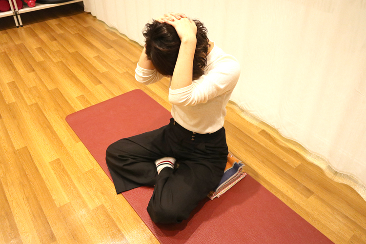 ① 背筋を伸ばしてあぐらで座り、両手を頭の後ろで組みます。