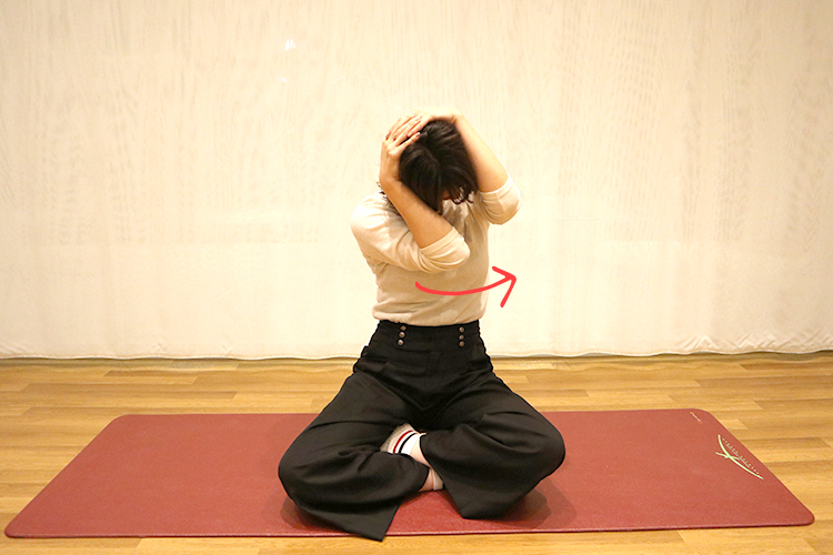② 息を吸いながら顔を挟むように肘を寄せ、息を吐きながら両手で頭を押すようにぐーっと下を向きます。