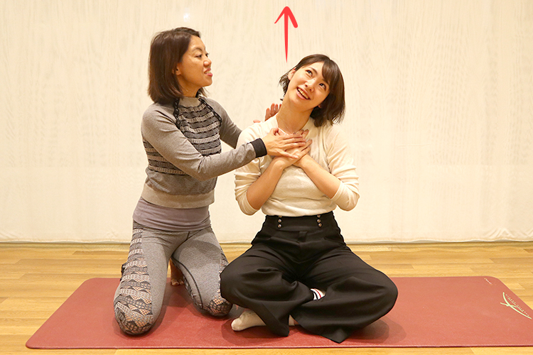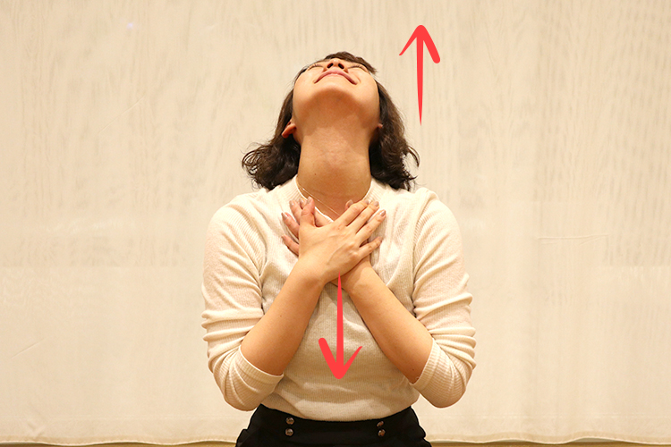 ① 背筋を伸ばしてあぐらで座り、のどの下あたりに両手を重ねたら、のどを伸ばすように手を下に引きながら、天井を見上げあごを高く上げます。