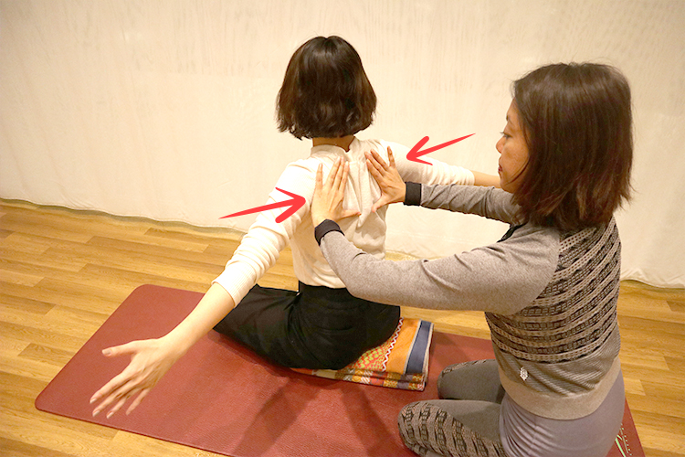 実際に行うと結構ハードですが、ここまでしないと固まった肩甲骨はなかなか動きません。強制的に肩甲骨を動かすことで血流が高まり、体全体がポカポカしてきますよ。
