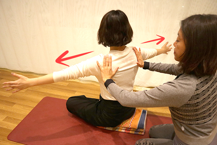 ② その位置から、さらに手を広げるように後ろに引き、グッと肩甲骨を寄せます。