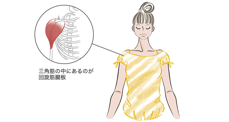 腕(上腕骨)は肩関節で「前」「後ろ」「外ねじり」「内ねじり」「内に開く」「横に閉じる」の6つの方向に動きます。特に大切なのは、腕をねじるときに使われる回旋筋腱板(かいせんきんけんばん)という筋肉。「肩のインナーマッスル」とも呼ばれます。回旋筋腱板は上腕骨を安定させる筋肉です。胸をしっかり開き肩を力まず下げた、正しい肩の状態で上腕骨が下に落ちないように安定させているのが回旋筋腱板なのです。